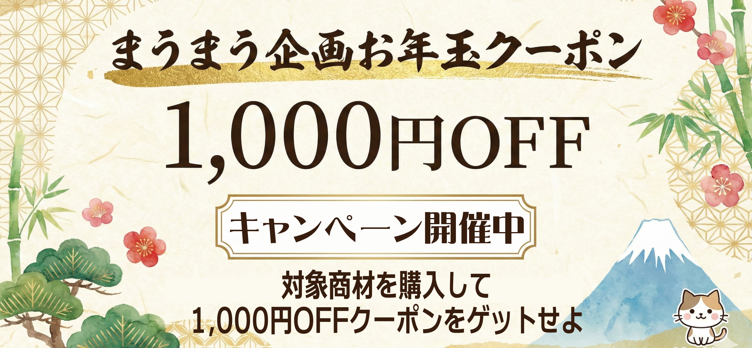 このお年玉クーポンをご利用になれば、今年一杯まうまう企画の商材やサービスを税込1,000円引きでご購入いただけます。