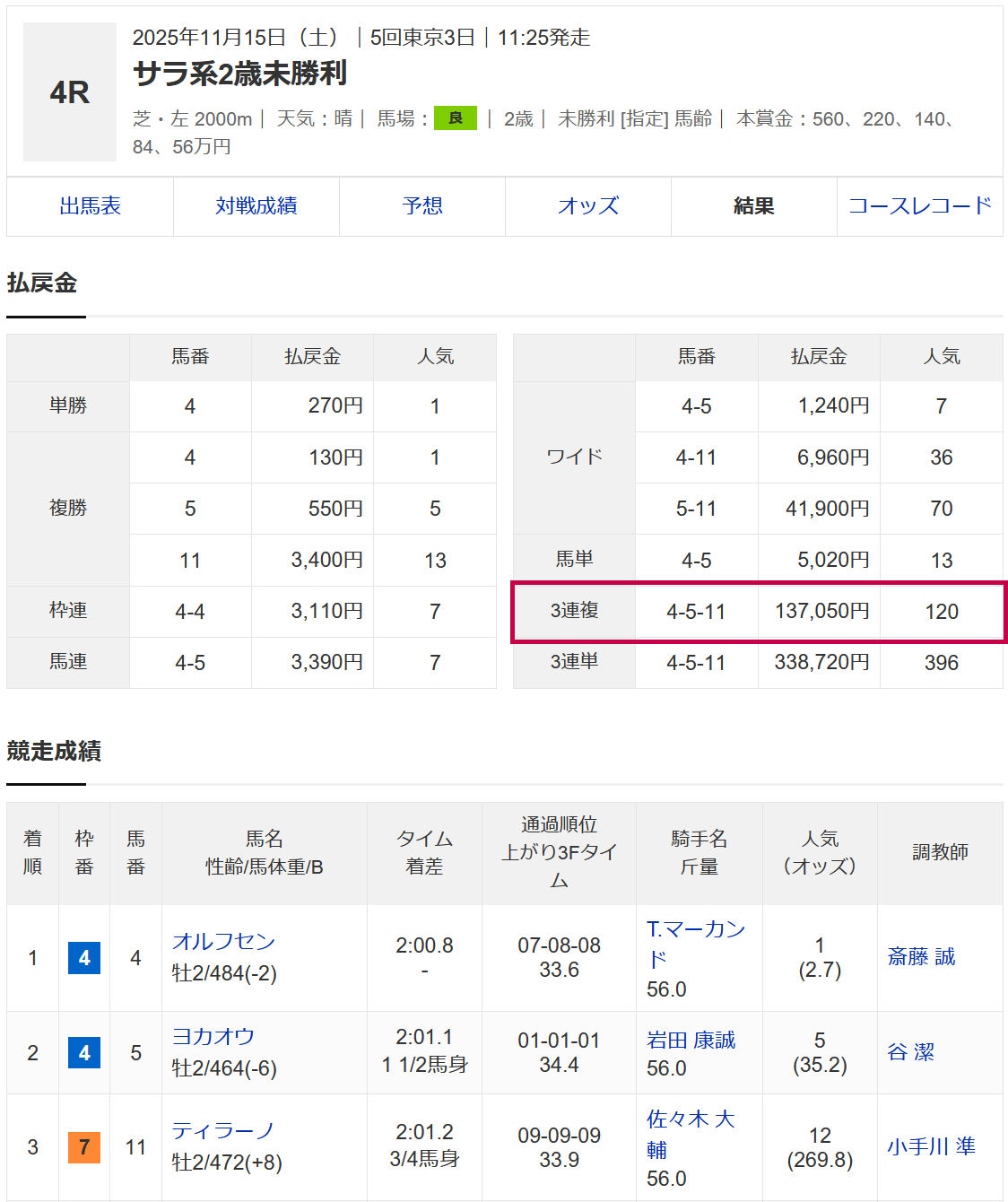 狙う馬券や点数などについては、後ほどじっくりとご紹介させていただきますが、2025年11月15日の東京4Rでは、ご覧のような3連複13万円馬券を僅か8点で仕留めました。