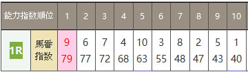 コンピ指数最下位の1番と、その次の9位5番の指数差を確認してください。