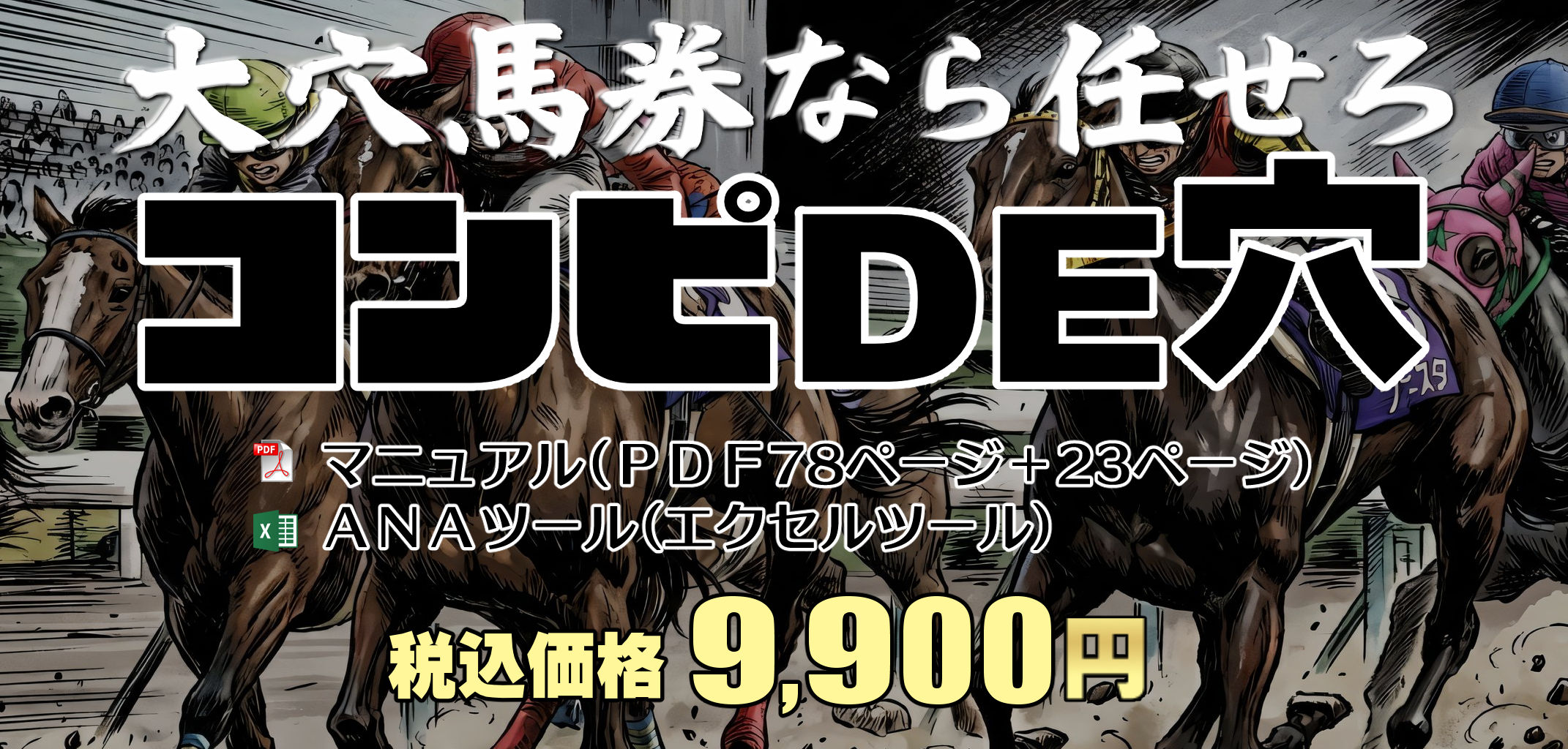 そこで、中央競馬(JRA)で穴馬を仕留めるためにアレンジを加え、ブラッシュアップさせたノウハウが、この新作『コンピDE穴』になります。