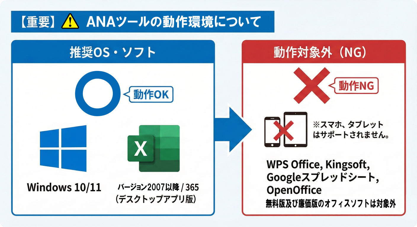 それにこのANAツールは、Excel(エクセル)(※)で作成されていますから、ソフトのようにインストール作業は一切不要。